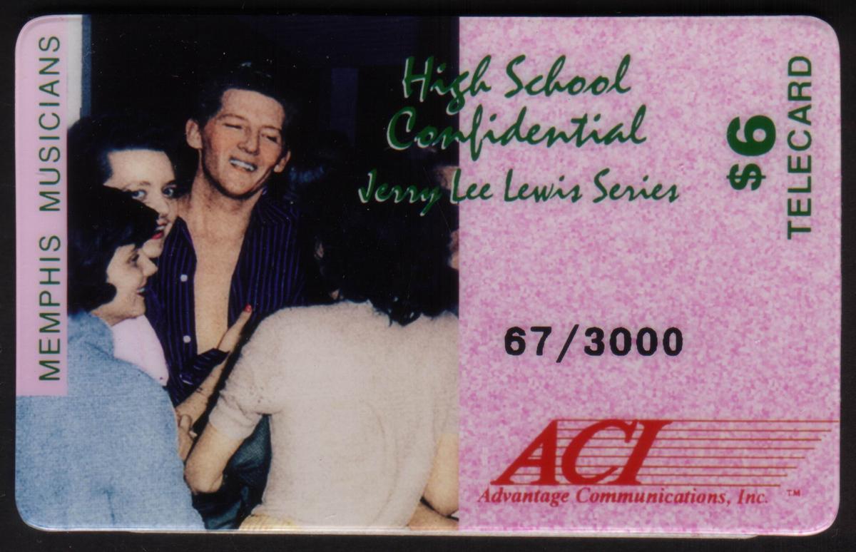 Vintage 1950s Americana phone card featuring Jerry Lee Lewis, Memphis scene, rock and roll energy, limited edition, collectible memorabilia.