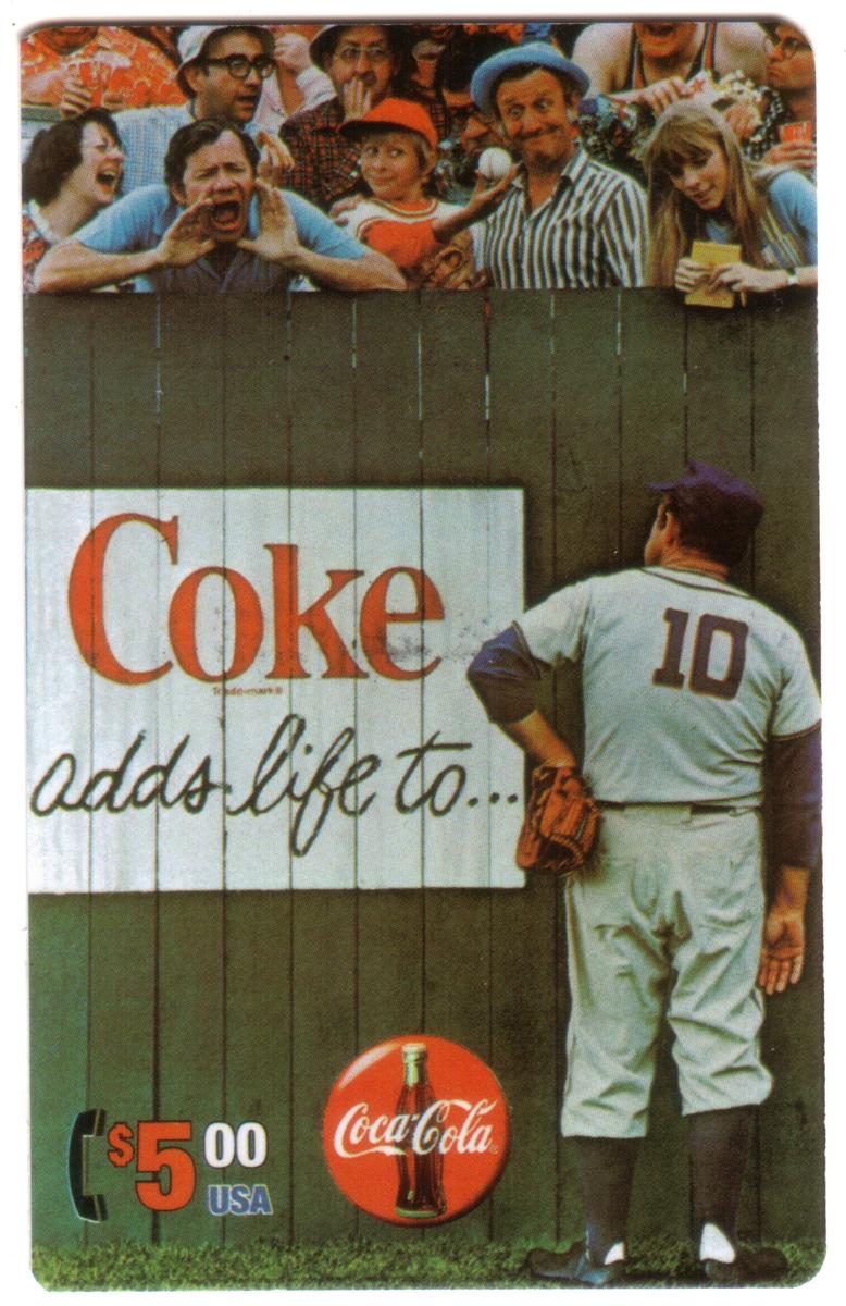 Above the crowd and player, the text "Coke Adds Life..." is prominently displayed in bold white letters against a red background, linking the card to Coca-Cola’s longstanding association with American culture and sports. The Coca-Cola logo appears at the upper left corner, reinforcing the brand’s identity. In the lower right corner, the text "Collect-A-Card" is printed, indicating that this card is part of a collectible series. The overall design integrates the spirit of baseball with Coca-Cola’s branding, making it a distinctive collectible piece celebrating both the sport and the popular beverage.