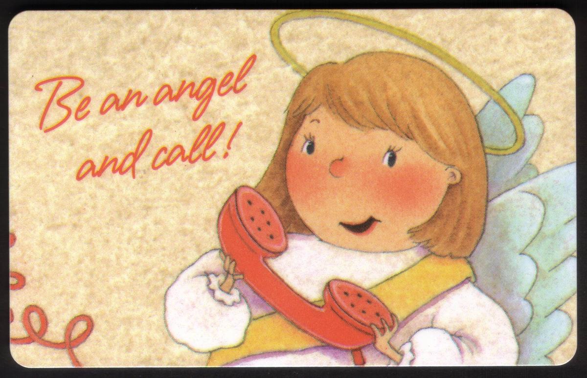 The card includes visual elements typical of Christmas greetings such as festive hues of gold, red, and green, along with the presence of a Christmas tree ornament or decoration partially visible near the angel figure. The handset depicted on the card is a traditional telephone receiver, symbolizing the concept of calling friends and family during Christmas. The card combines religious and technological elements, reflecting the merging of faith and modern communication.