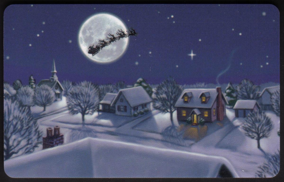 The card captures the spirit of the holiday season, combining the traditional imagery of Santa’s journey with vivid details like snow-covered buildings and clear nighttime skies. The colors emphasize the cold winter atmosphere with whites and blues, contrasted by the warm, red hue of Santa’s outfit. This Hallmark card reflects a classic Christmas theme with a joyful, nostalgic mood.