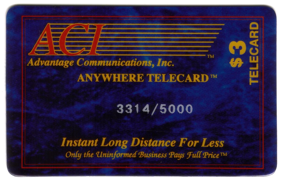 This collectible phone card is issued by Advantage Communications, Inc. and prominently features the corporate branding of ACMI Corporate Anywhere Telecard BLUE. The card offers prepaid long-distance calling services, highlighting its use for instant long-distance calls with a balance of three dollars. The text on the card includes the phrases “instant long distance for less” and “prepaid flex’net $3,” clearly indicating its function as a prepaid telecommunication tool.