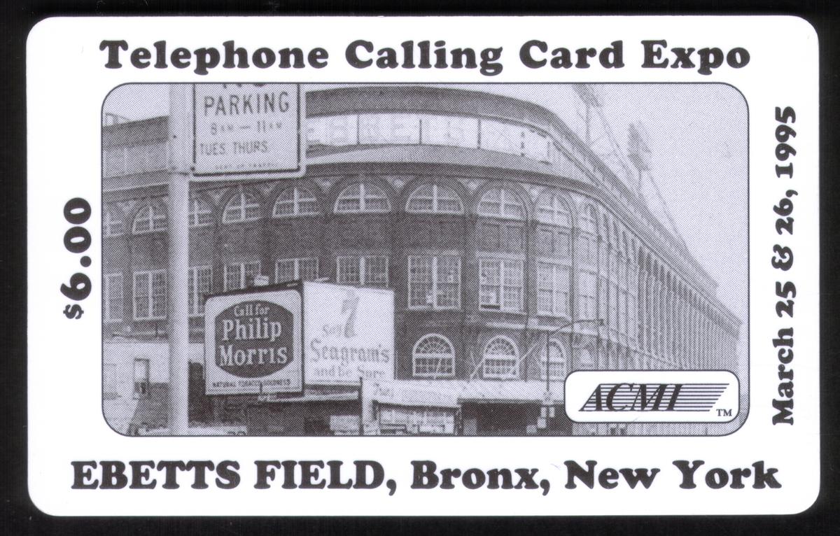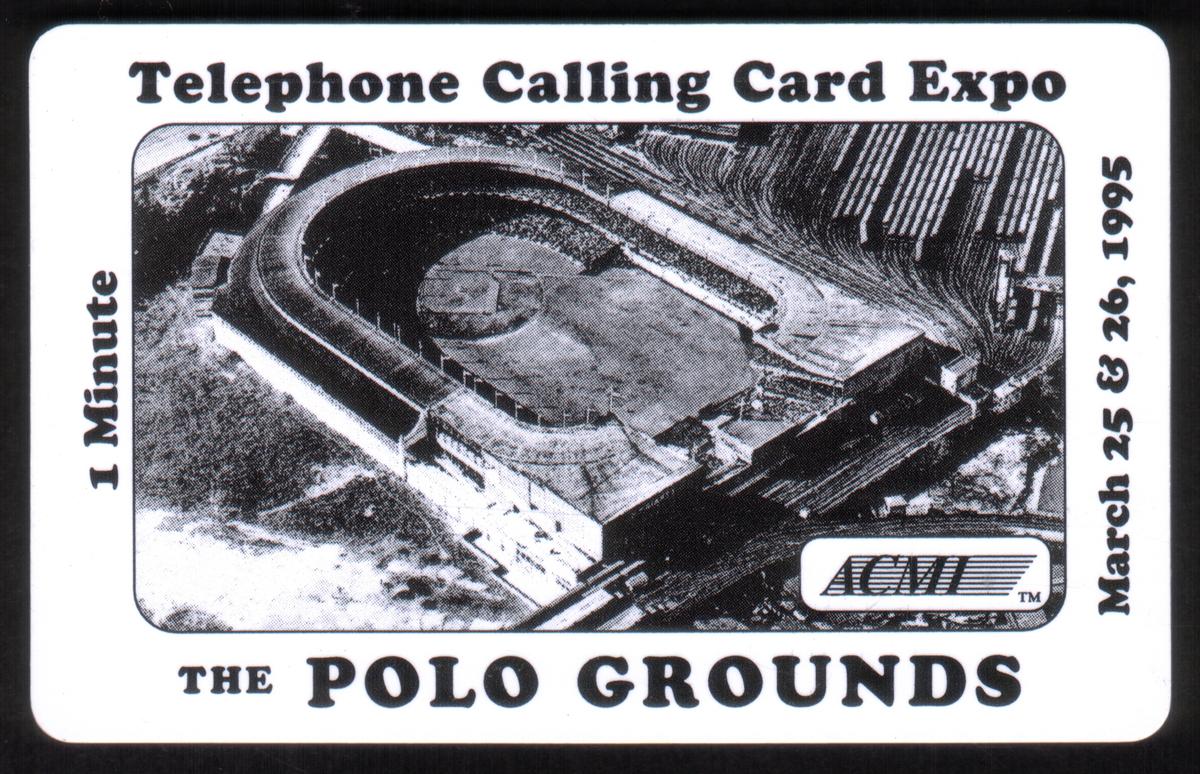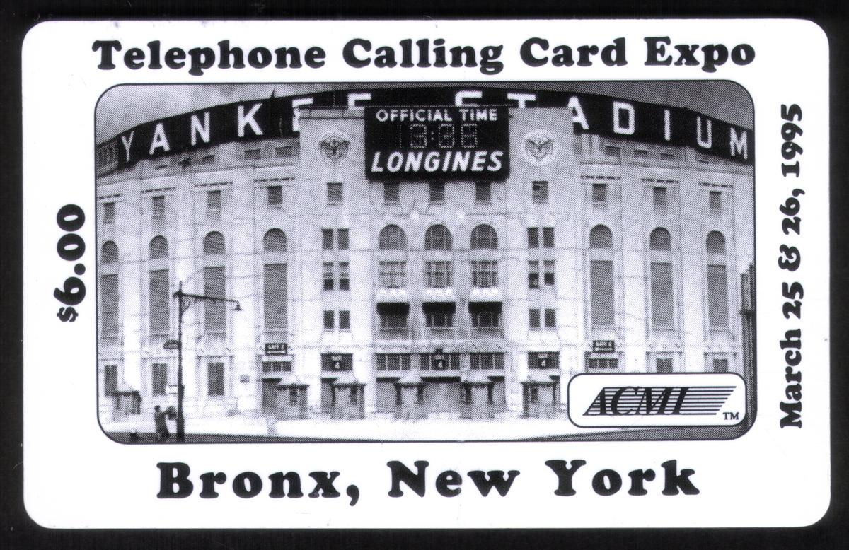 This set of four collectible telephone calling cards highlights legendary New York baseball landmarks and historic moments linked to the Yankees and their storied past. Each card was issued by ACMI for the Telephone Calling Card Expo held on March 25 and 26, 1995, in the Bronx, New York. The cards display monochrome photographic images with accompanying text and pricing, reflecting a vintage Americana theme around New York baseball.
