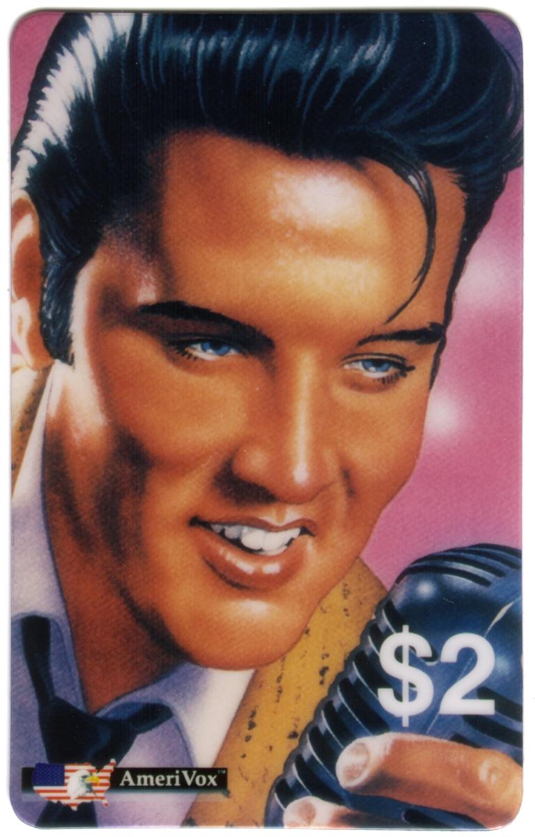 The card displays the denomination "$2" prominently on the right side near the microphone. The bottom left corner bears a small graphic of the American flag accompanied by the text "AmeriVox." The card commemorates Elvis Presley, referencing his status as an American icon in music and entertainment.