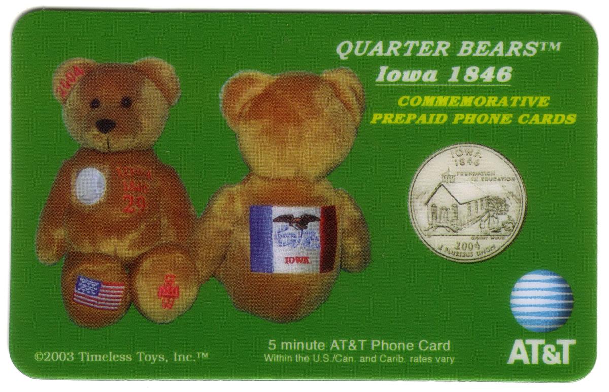 Text on the card includes “QUARTER BEARS™ Iowa 1846,” “COMMEMORATIVE PREPAID PHONE CARDS,” and “5 minute AT&T Phone Card Within the U.S., Can, and Carib. rates vary.” The AT&T logo is located in the lower right corner. Copyright information at the bottom left credits Timeless Toys, Inc., dated 2003.