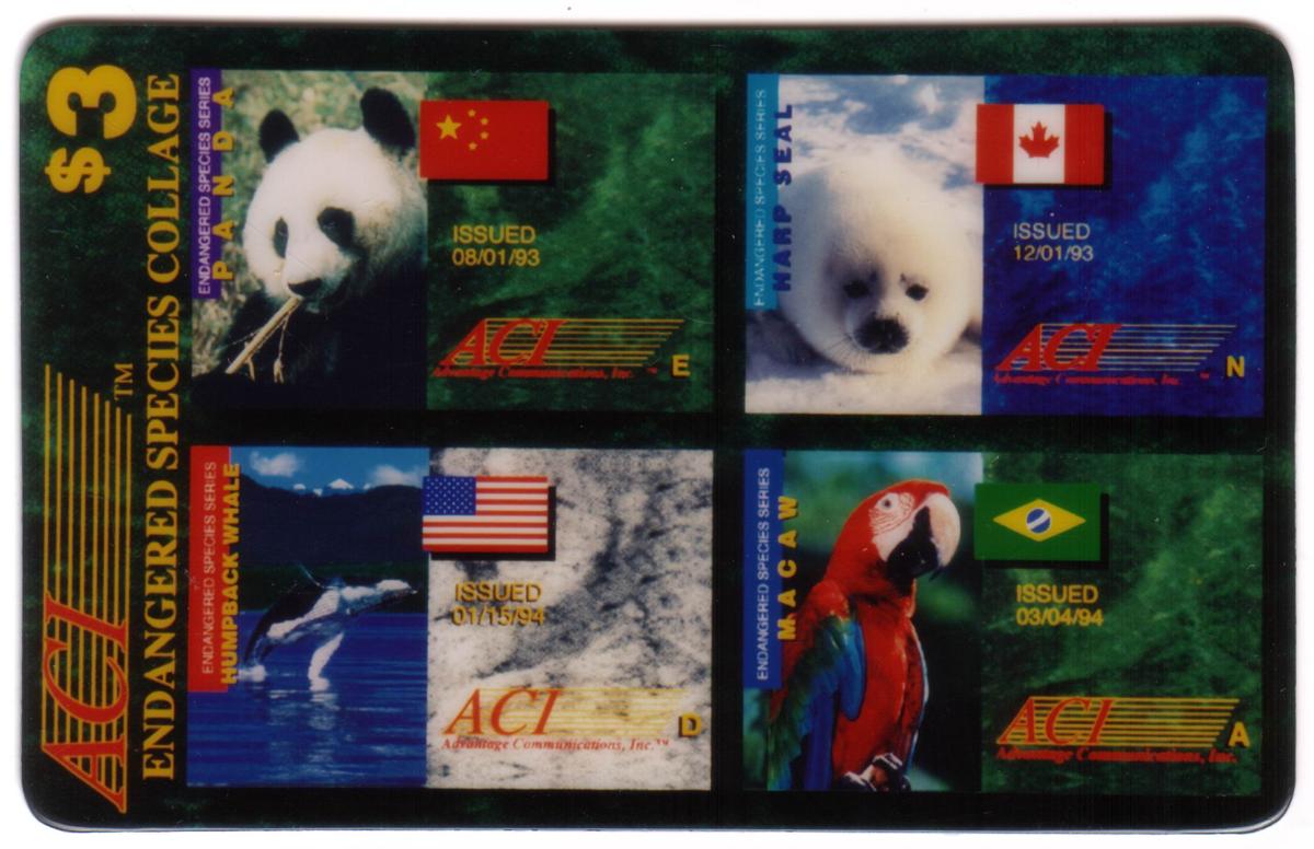 Valued at 3, this card features four endangered animals with flags, issuance dates, and ACI logo, highlighting global conservation efforts and wildlife protection. |