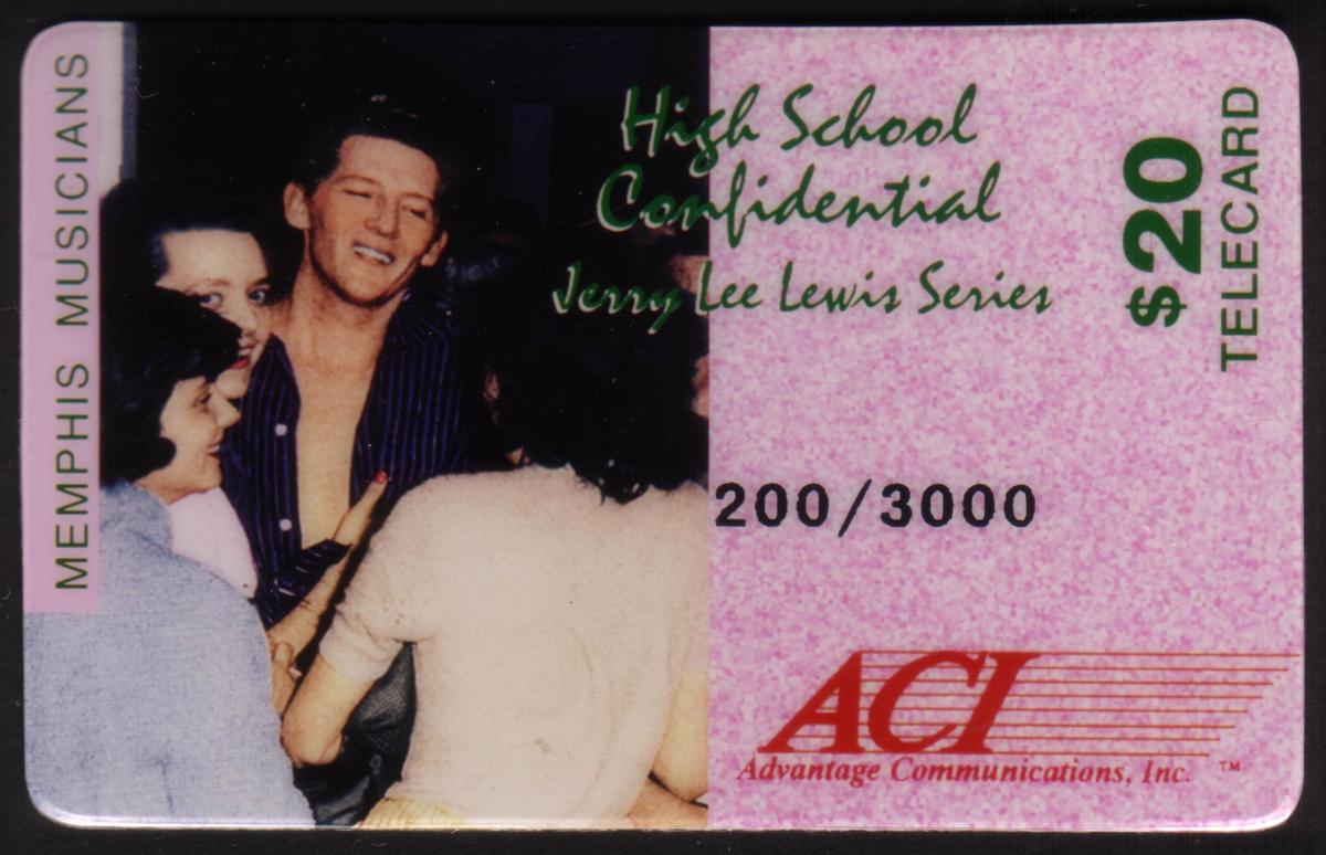 Limited edition $20 telecard honoring Jerry Lee Lewis, featuring 1950s Memphis rock and roll imagery, nostalgic design, and collectible serial numbering.