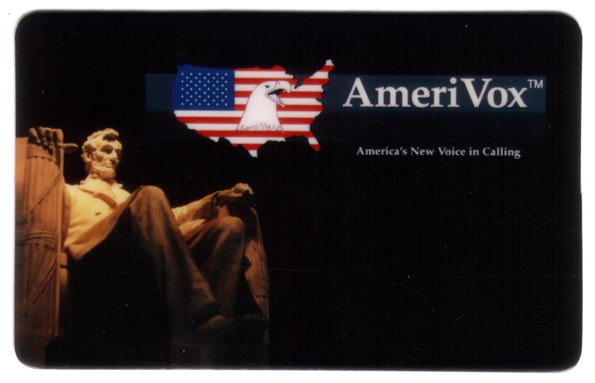 The bottom portion of the card contains the AmeriVox name in small text, and the entire card measures phone card size (CC Size). The card’s design clearly reflects Americana and American historical landmarks, celebrating iconic sights of Washington DC and American symbols, such as the eagle and the Lincoln Memorial.
