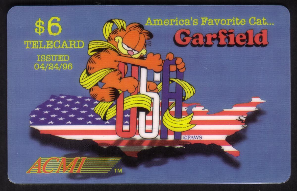 In the upper corners, there are values marked as "6$", indicating the card’s usage or worth. The card is identified as a collectible phone card specimen issued by ACMI. The design incorporates both American symbols and the well-known animated character Garfield, linking themes of patriotism with popular culture.
