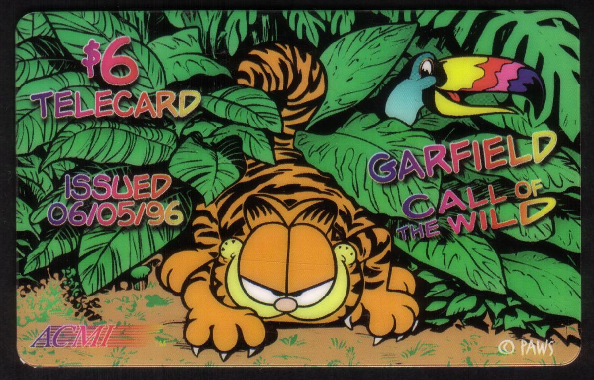 Vibrant Garfield jungle-themed phone card featuring mischievous tiger cub Garfield, colorful tropical background, and playful design from the 1990s.