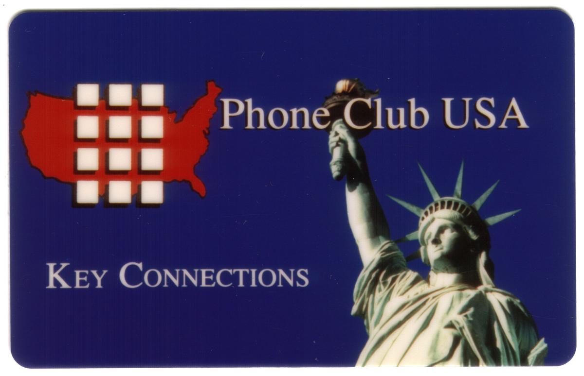 The text on the card includes “Phone Club USA” near the top center-right and “KEY CONNECTIONS” towards the lower left, both printed in white capital letters. The overall design emphasizes themes of communication and connection within the United States, reinforced by the symbolic representation of the dialing pad and the iconic Statue of Liberty.