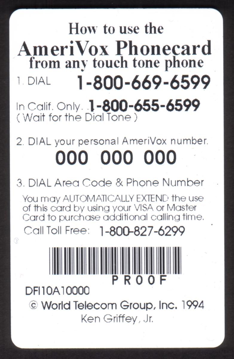 The lower left corner of the card displays the AmeriVox logo alongside an American flag motif, highlighting its American origin. The card's denomination is printed as $10 in white on the lower right side, identifying its value. This specimen proof card honors Ken Griffey, Jr., one of Major League Baseball’s Most Valuable Players (MVPs), and resonates with themes of Americana through the inclusion of baseball and American flags.