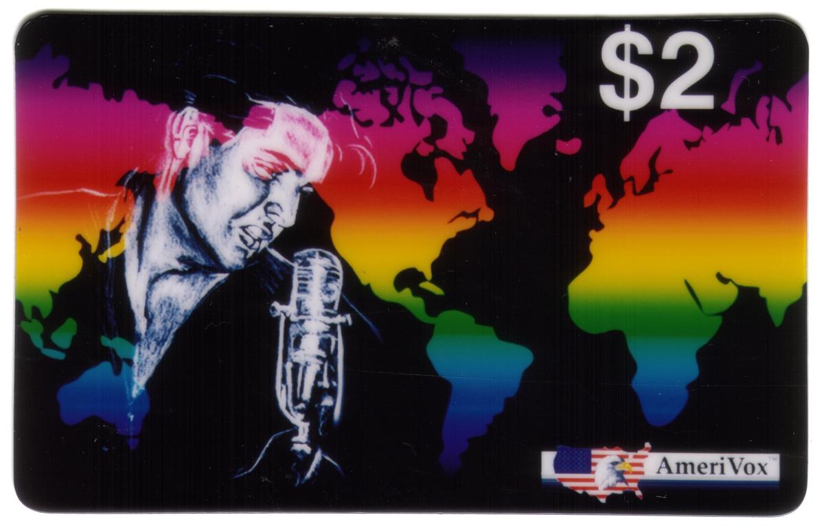Elvis Presley portrait with vibrant rainbow background, black silhouette map, $2 value, AmeriVox branding, blending iconic imagery with modern colorful design.