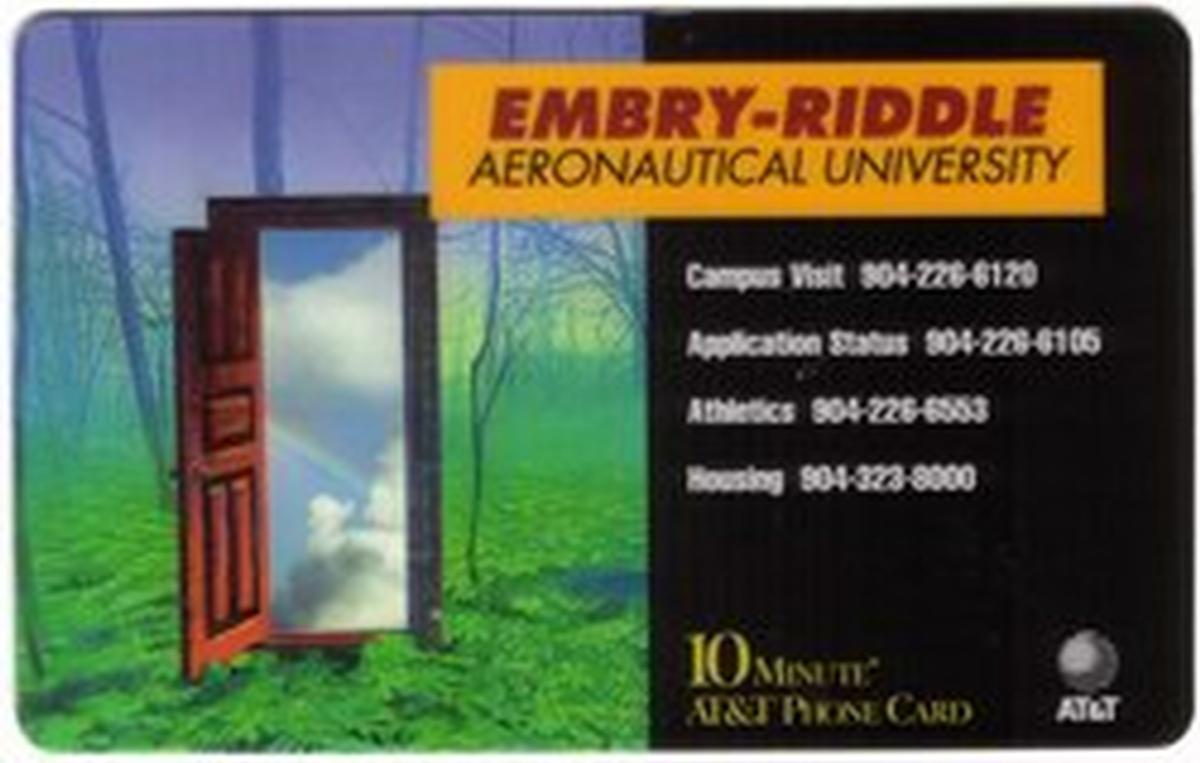 This phone card represents a collectible item connected to Embry-Riddle Aeronautical University and the Jacksonville area, combining natural imagery with university branding. The presence of the forest, doorway, and rainbow creates a unique visual composition that complements the institutional references on the card.