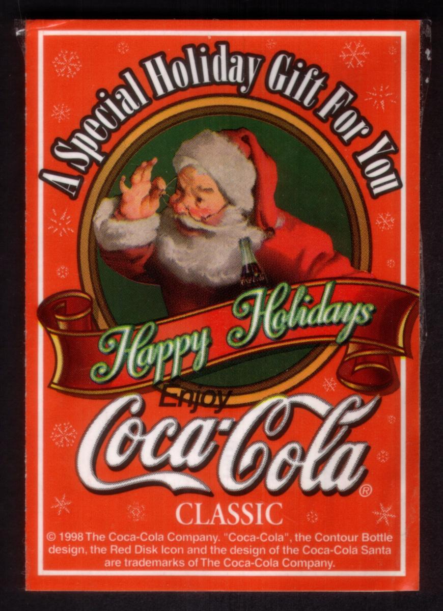 This collectible Coca-Cola phone card from 1998 features a classic holiday design prominently displaying Santa Claus holding a Coca-Cola bottle. Santa is depicted with his traditional white beard, red hat, and red suit trimmed with white fur. He is framed within a circular green background with a golden rim, giving a festive and vintage feel to the card.