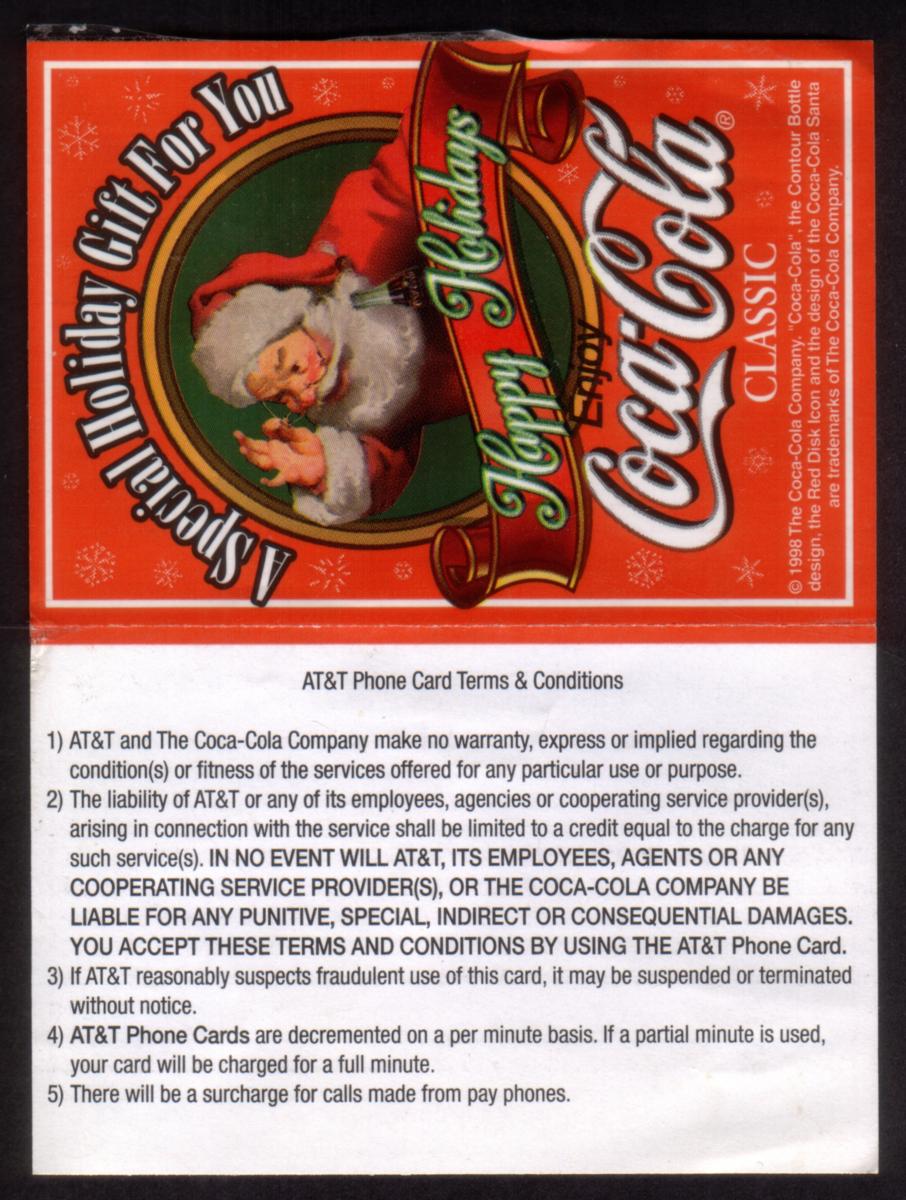 The bottom portion of the card includes trademark information stating that the Coca-Cola Company owns the Coca-Cola name, the contour bottle design, the Red Disk Icon, and the design of the Coca-Cola Santa as registered trademarks. The red background of the card is decorated with faint snowflake patterns, adding to the Christmas theme. This card was issued by AT&T and is a peel-off collectible card celebrating Christmas with a cheerful Santa Claus and classic Coca-Cola branding.
