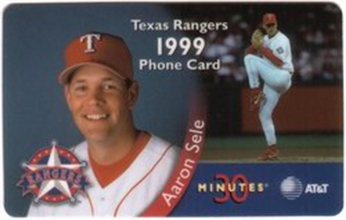 The overall presentation of the card reflects a promotional effort tied to both the Texas Rangers baseball team and AT&T, making it a distinct collectible piece for enthusiasts of sports memorabilia and corporate partnerships from the late 1990s. The inclusion of specific references to Aaron Sele and the Texas Rangers ensures the card’s clear identity within baseball history and promotional collectibles.