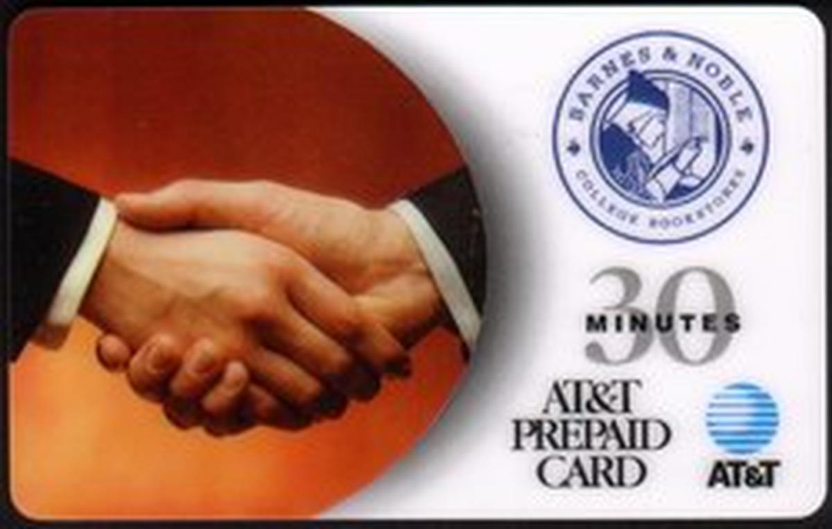 The design uses a blue background, and the overall composition highlights the collaboration between AT&T and Barnes & Noble College Bookstore. The card is marked for 30 minutes of usage time, consistent with its identification as a phone card for prepaid calling services.