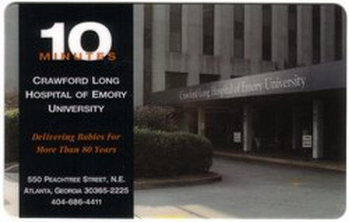 This collectible phone card features the name and logo of Crawford Long Hospital of Emory University, located in Atlanta, Georgia. The card highlights the hospital’s history of delivering babies for more than 80 years. The design includes the text “Crawford Long Hospital of Emory University (Atlanta, GA)” prominently displayed, along with a clean blue background. The AT&T logo appears near the top right of the card, indicating the telecommunications provider.