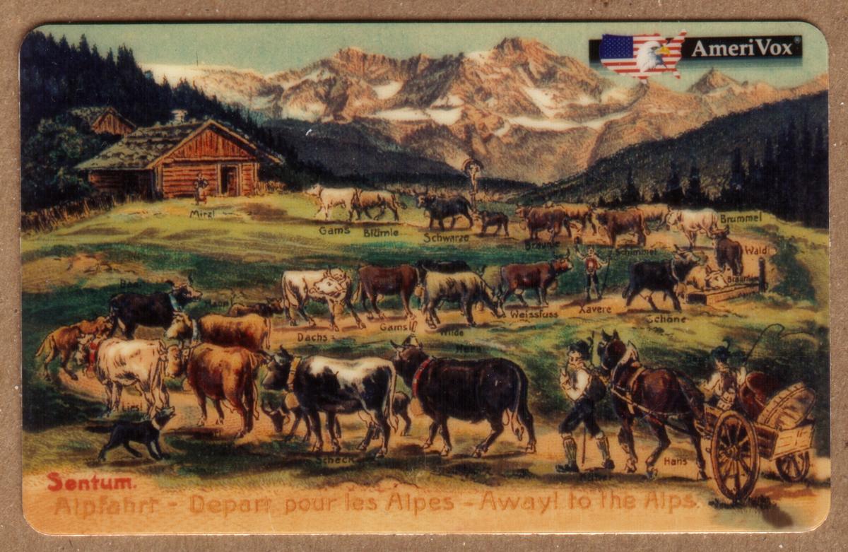 The artwork uses natural colors and balanced composition to capture the essence of farm life and the cultural practice of alpine cattle driving. The presence of the animals’ names adds a personalized touch, connecting the viewer directly with the farming heritage. This phone card reflects a rural theme honoring mountain farming traditions in the Alps, making it a notable collectible for those interested in agricultural or alpine culture.