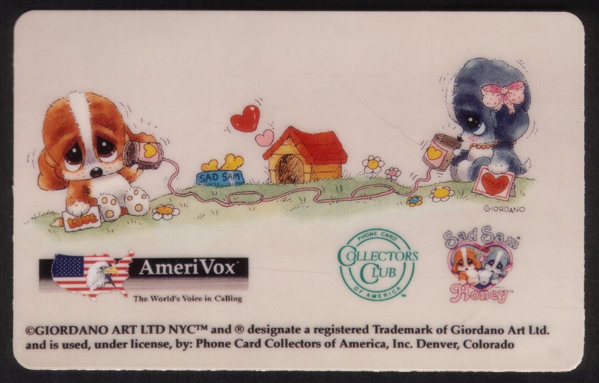 Whimsical Sad Sam and Honey phone card featuring playful puppy artwork, pastel colors, love hearts, daisies, and nostalgic communication themes. |