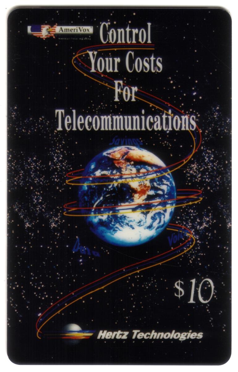 At the bottom right portion of the card, the brand name “Hertz Technologies” is prominently displayed in black, accompanied by the tagline “Control Your Costs for Telecommunications, Computer Networking, IT, Information Technology” in smaller text beneath it. The word “SPECIMEN” is typed in a grayish font across the middle portion of the card. The provider “AmeriVox” appears in a small font near the lower right corner, confirming the issuer of the card.