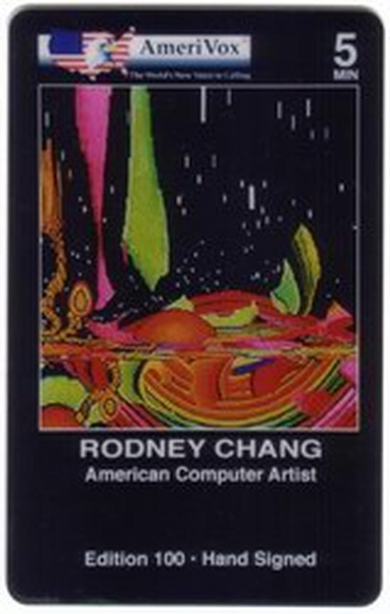 Limited edition AmeriVox phone card featuring Rodney Chang''s vibrant digital artwork, signed, 5-minute use, blending telecommunications with computer art.