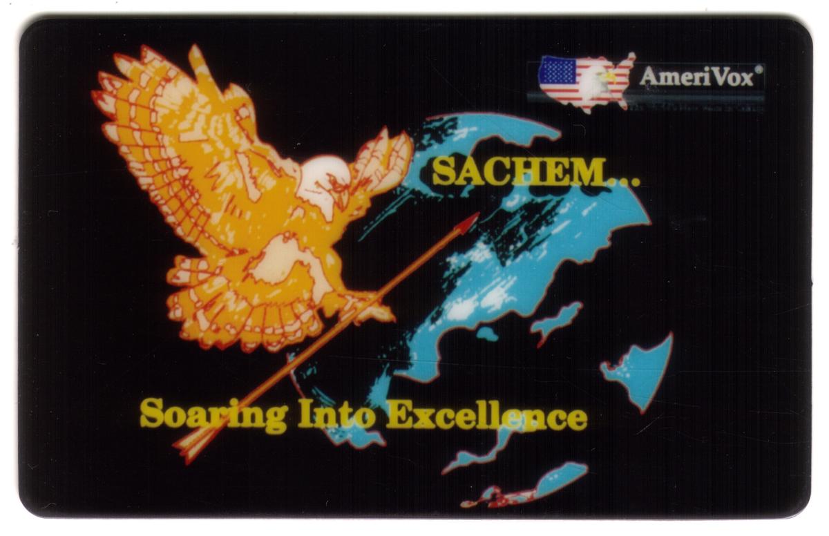 The card also includes text referencing the New York school district, highlighting connections to teaching, learning, and artistic achievement. The presence of the word "Sachem" ties the card to the Sachem school district, reinforcing the educational and community context behind the imagery. The overall composition uses a clean, bright color palette with artistic elements that underline excellence and progress in education.