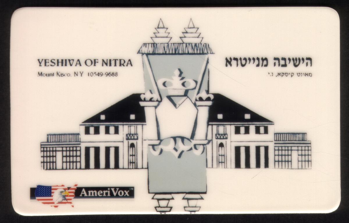In the lower left corner, there is a small American flag alongside the AmeriVox logo, indicating the card's provider. The overall appearance of the card is simple and professional, emphasizing the cultural and religious significance of the Yeshiva of Nitra within the Jewish educational community. This card clearly serves as a collectible item related to Judaica and Jewish religious institutions.