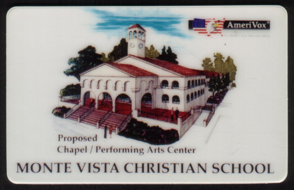 This promotional item serves as a collectible reflecting Monte Vista Christian School’s efforts to raise funds for their chapel. Its presentation includes clear identification of the institution, the nature of the fundraiser, and AmeriVox as the issuing company. The card highlights the connection between education, architecture, and community support without displaying unrelated images or text.