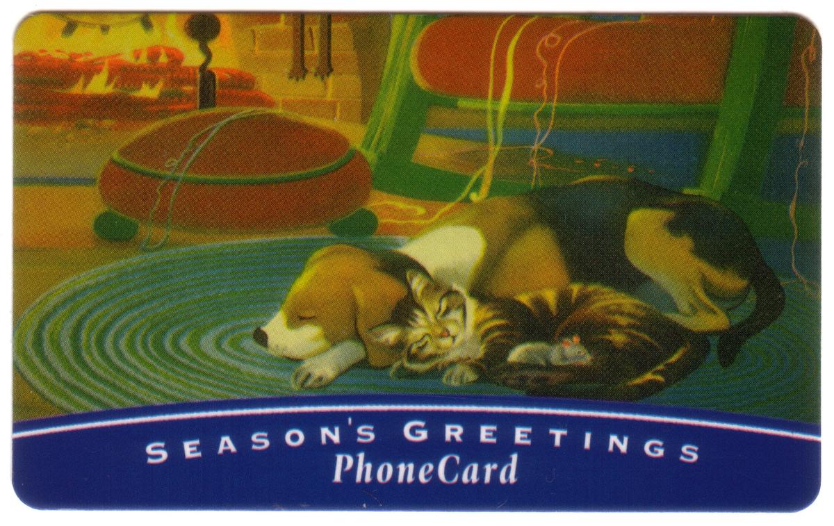 The first card shows a cozy indoor scene with a sleeping brown and white dog curled beside a tabby cat on a blue circular rug in front of a glowing fireplace. The warmth and calmness are highlighted by the glowing fire and the gentle steam rising from a container nearby. The text "SEASON’S GREETINGS PhoneCard" is displayed at the bottom on a blue banner.
