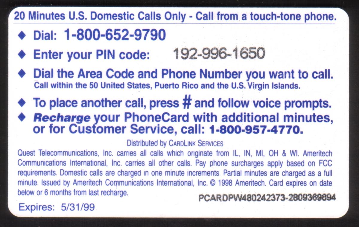 Since we have the world's largest inventory of USA phonecards for collectors, you will not necessarily receive the identical serial/batch/PIN number that we have scanned/pictured.