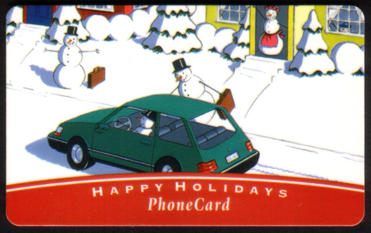 The second card depicts a snowy outdoor suburban neighborhood with three snowmen, two near the house and one near the driveway. A green hatchback car is parked on the snow-covered street with a snowman visible behind the steering wheel. A woman dressed in red stands outside the house looking out the window. The phrase "HAPPY HOLIDAYS PhoneCard" is shown along the bottom on a red banner.