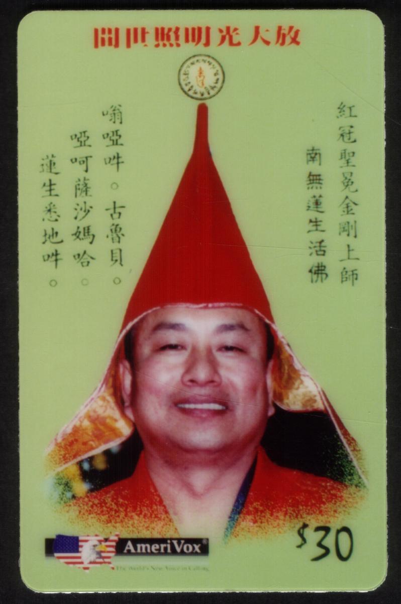Buddhist phone card featuring Grand Master Lu Sheng-yen in traditional robes and red hat, with Chinese chants, Buddhist symbols, and $30 denomination. |