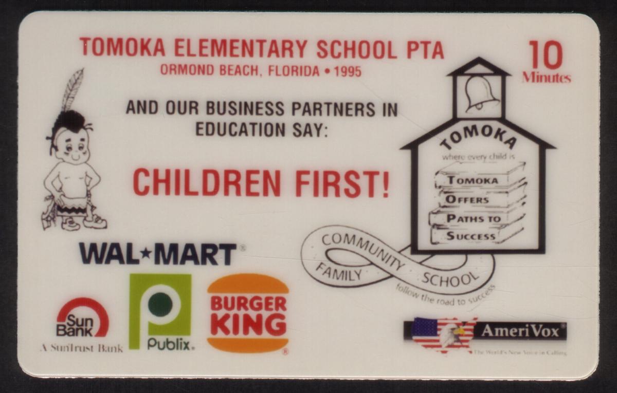 Tomoka Elementary PTA phone card featuring local sponsors Walmart, Burger King, Publix, and Sun Bank, emphasizing children first and community success. |