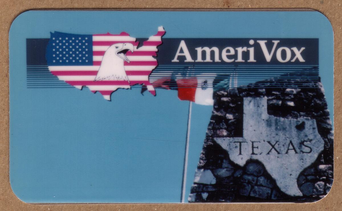 At the bottom right corner, the Texas state flag is depicted with its single white star, vertical blue stripe, and horizontal red and white stripes. The card includes the denomination values "$10./$100" printed in clear, bold font on the lower portion of the card. Along the top edge, text reads “The Alamo, Texas” in strong, readable type, establishing the location. The name “AmeriVox” is printed discreetly, associating the card with the issuing entity.