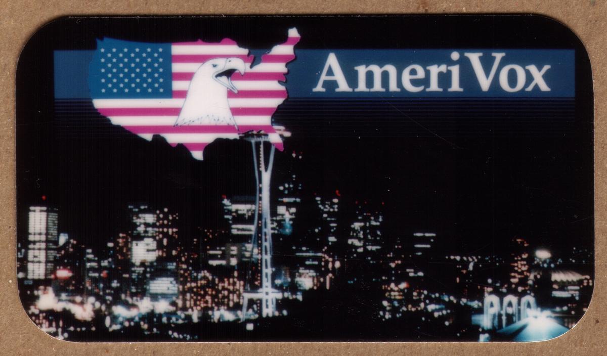 Text on the card identifies it as “Seattle Skyline - Washington” and includes the brand name “AmeriVox” along with the year “1992.” The design aligns with thematic interests in scenic views, city skylines, skyscrapers, and architecture. The card serves as a collectible item capturing the spirit of Seattle’s urban landscape.