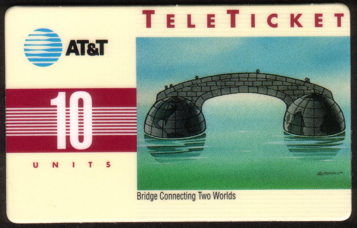 This collectible AT&T Teleticket phone card features an artistic design highlighting telephones and communication themes. Central to the card’s composition is a large representation of an old-fashioned rotary telephone, rendered in white and set against a deep blue background. Surrounding the phone are multiple stylized images of telephone handsets, emphasizing the evolution and variety of phone devices. The imagery is integrated with a world globe motif, symbolizing global communication.