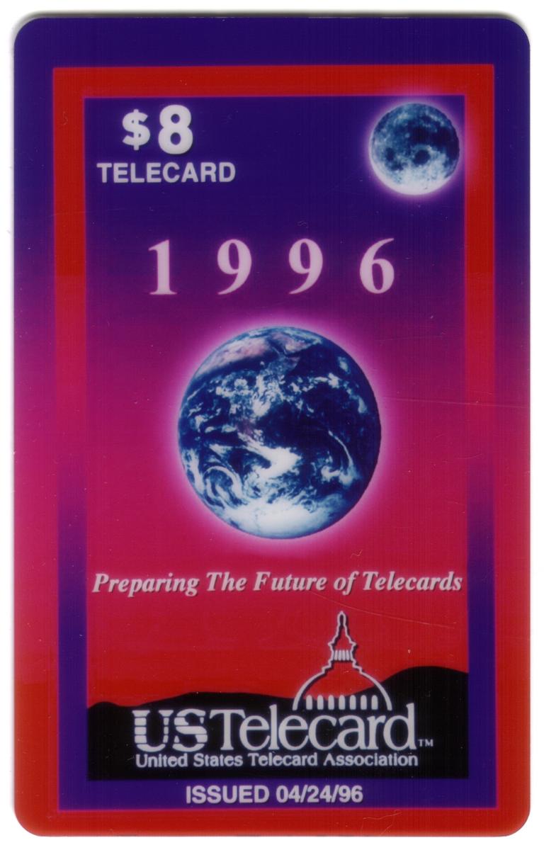 1996 US Telecard Association $8 telecard featuring Earth and moon imagery, symbolizing global connectivity and telecommunication innovation.