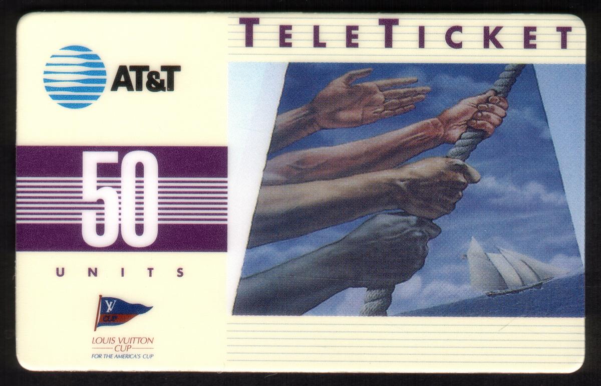 AT&T sailing-themed phone card featuring America''s Cup and Louis Vuitton Cup logos, with teamwork imagery and maritime design elements.