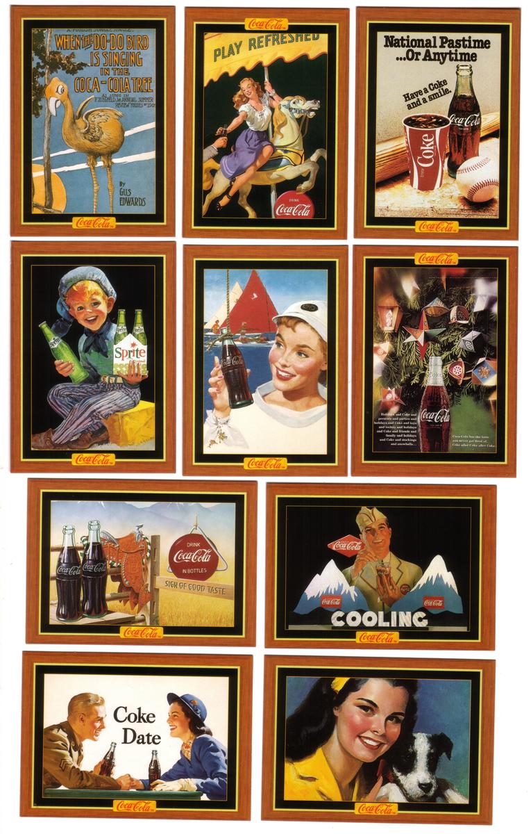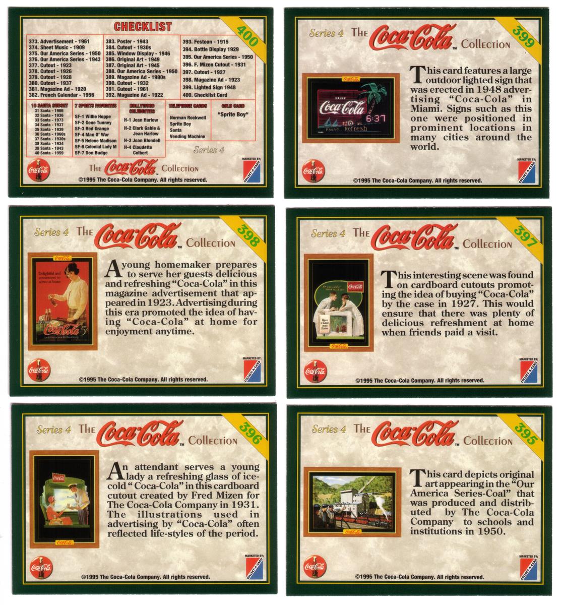 Vintage 1995 Coca-Cola Series 4 trading cards featuring nostalgic ads, Americana scenes, vintage branding, and iconic Coca-Cola characters from early 20th-century advertising.