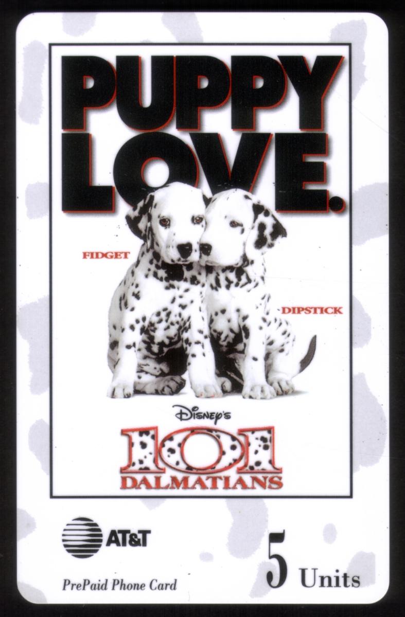 This set of five collectible prepaid phone cards from AT&T features Disney's 101 Dalmatians promotional artwork. Each card has a white background patterned with subtle dalmatian spots. The center of each card showcases a photograph of one or two dalmatian puppies from the Disney movie, with the title "Disney's 101 Dalmatians" printed below in a stylized red and black font that mimics dalmatian spots.