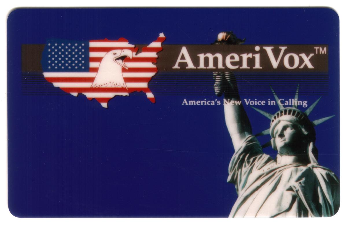Patriotic American phone card featuring the U.S. map with flag, eagle, Statue of Liberty, and AmeriVox branding, symbolizing strength, freedom, and modern calling.