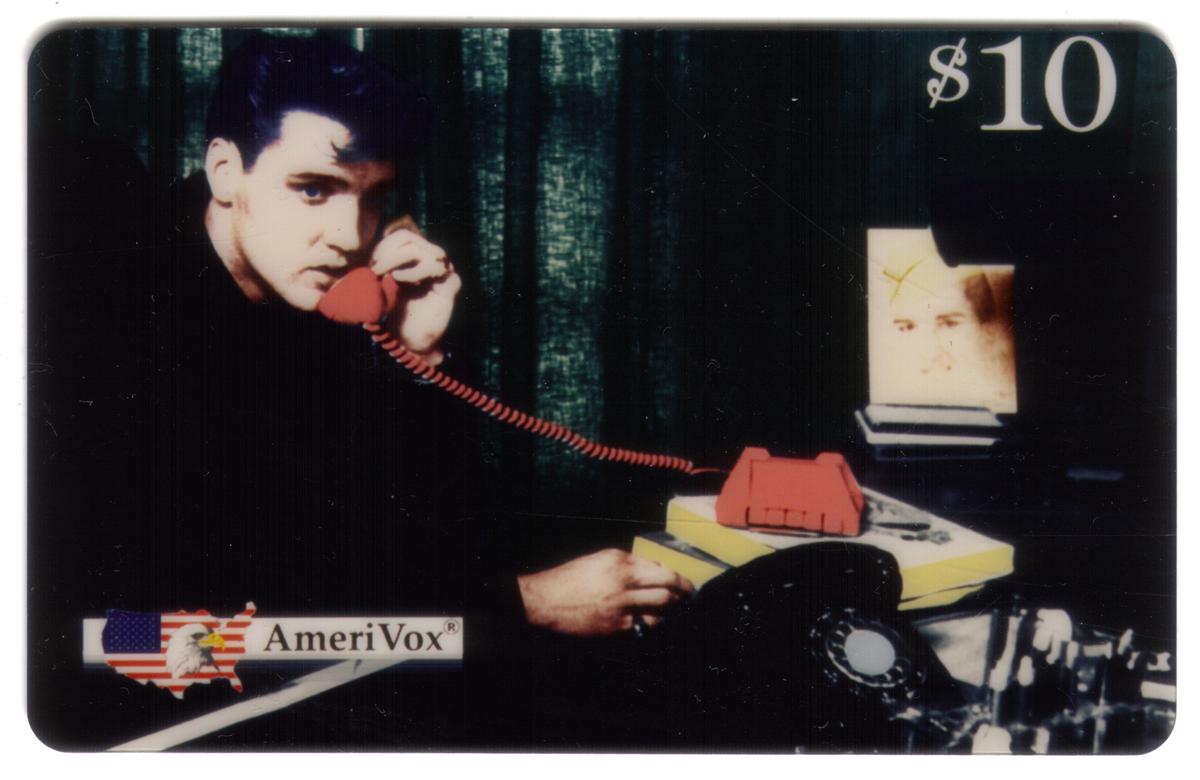 The phone card has a $10 value, clearly indicated in the top right corner. The lower left corner displays the AmeriVox logo alongside a small American flag, establishing the card’s origin. This card is part of a series that celebrates iconic American entertainment figures and locations, linking Elvis Presley’s legendary presence with the themes of singers, musicians, actors, and Hollywood.