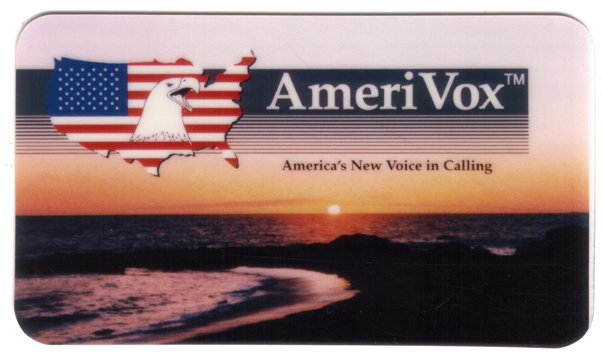 1992 AmeriVox phone card featuring a vibrant ocean sunset scene, American flag map, screaming eagle, and patriotic design, symbolizing strength and communication.
