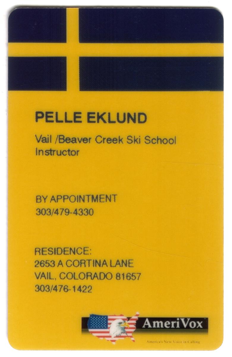 Pelle Eklund, Vail and Beaver Creek ski instructor, Swedish heritage, contact info, Colorado ski resorts, collectible phone card with American eagle logo.