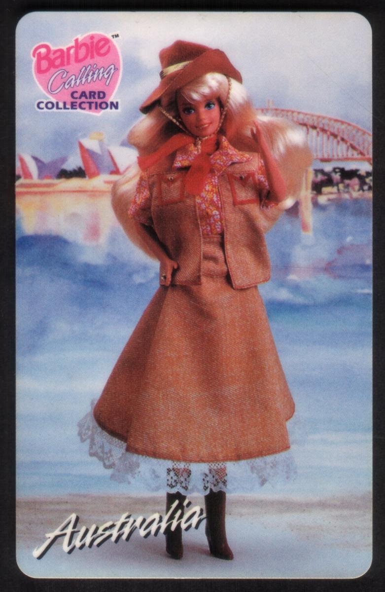 This collectible phone card features a Barbie doll dressed in traditional Australian attire as part of the Barbie Calling Card Collection. The doll wears a long tan skirt with lace trim at the bottom, paired with a matching tan jacket over a floral-patterned blouse. She accessorizes with a wide-brimmed hat that tilts to one side, complementing her long blonde hair styled loosely. The doll stands confidently with one hand on her hip against a scenic background that includes the Sydney Opera House and Sydney Harbour Bridge, iconic landmarks of Australia.