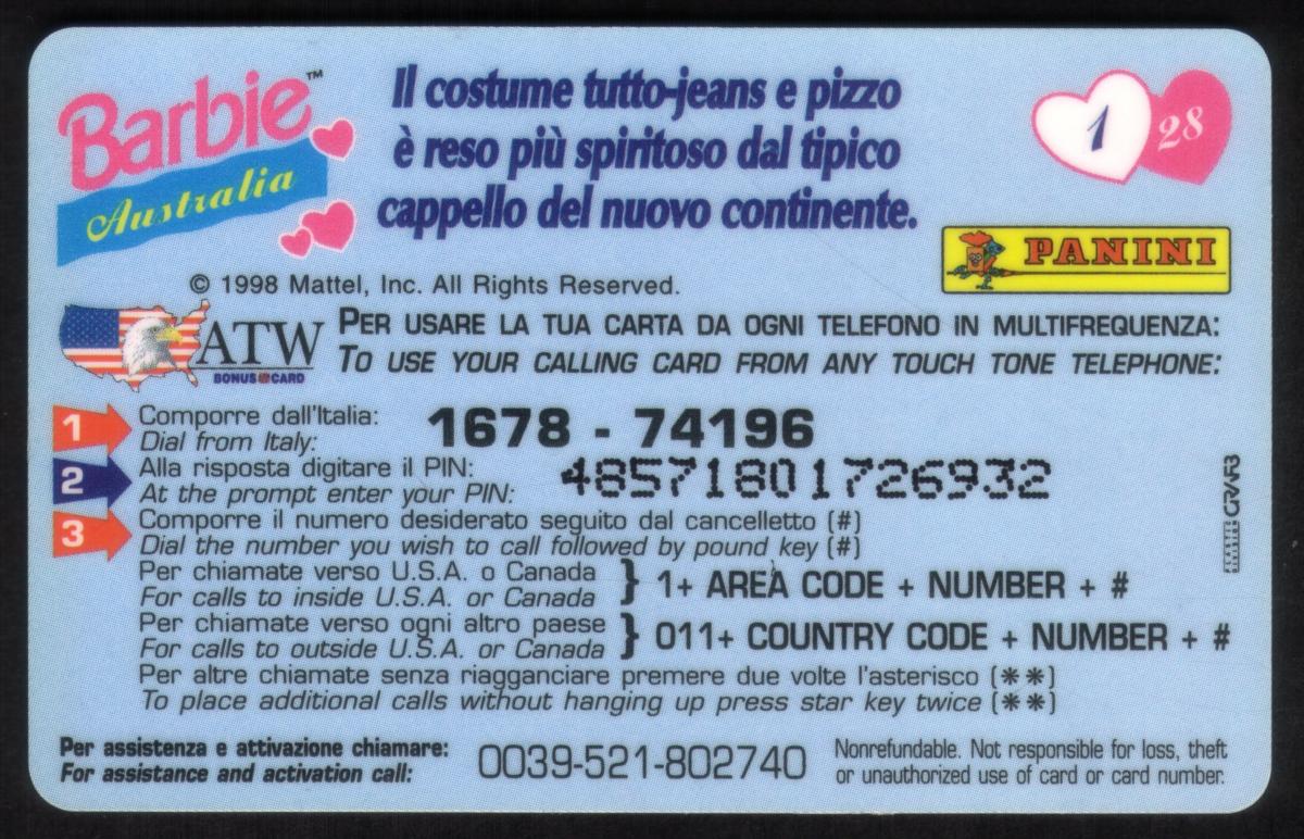 This phone card was produced by Mattel Inc. in 1998 and is intended for use in Italy. It is numbered #1/28 in the series, indicating it is the first card in a set of 28. The card highlights Barbie’s representation of Australian native dress within the themed collection.