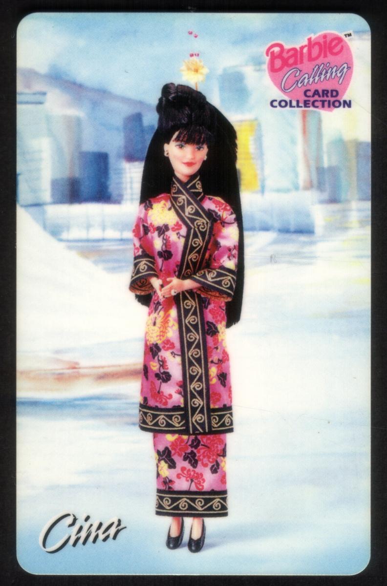 This collectible card from the Barbie Calling Card Collection features a Barbie doll dressed in traditional Chinese native attire. The doll wears a pink dress adorned with floral patterns in red, yellow, and black, with intricate black borders accented by gold designs along the edges of the sleeves, collar, and hem of the dress. Barbie’s long black hair is styled in an updo with a decorative hair accessory featuring a small yellow flower, complementing the cultural theme of the outfit.