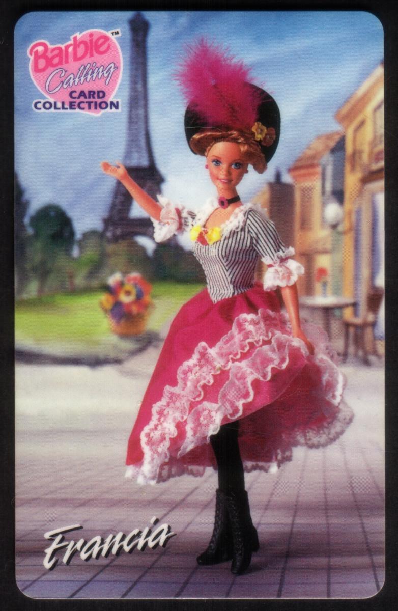This collectible phone card from the Barbie Calling Card Collection features a Barbie doll dressed in a traditional French costume. The Barbie is posed in an outdoor setting with the Eiffel Tower clearly visible in the background, establishing the location as France. The doll wears a detailed outfit with a fitted black and white striped bodice, puffed white sleeves, and a deep pink skirt adorned with white lace ruffles.