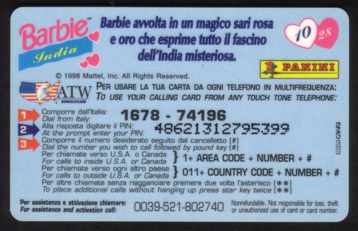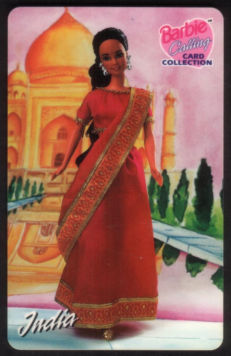 Produced by Mattel Inc. in 1998, this card is part of a Barbie-themed collectible series showcasing Barbie dolls in traditional dresses from various countries. The emphasis on Indian attire and the culturally significant landmark makes it a unique collectible relating to both Barbie dolls and Indian heritage.